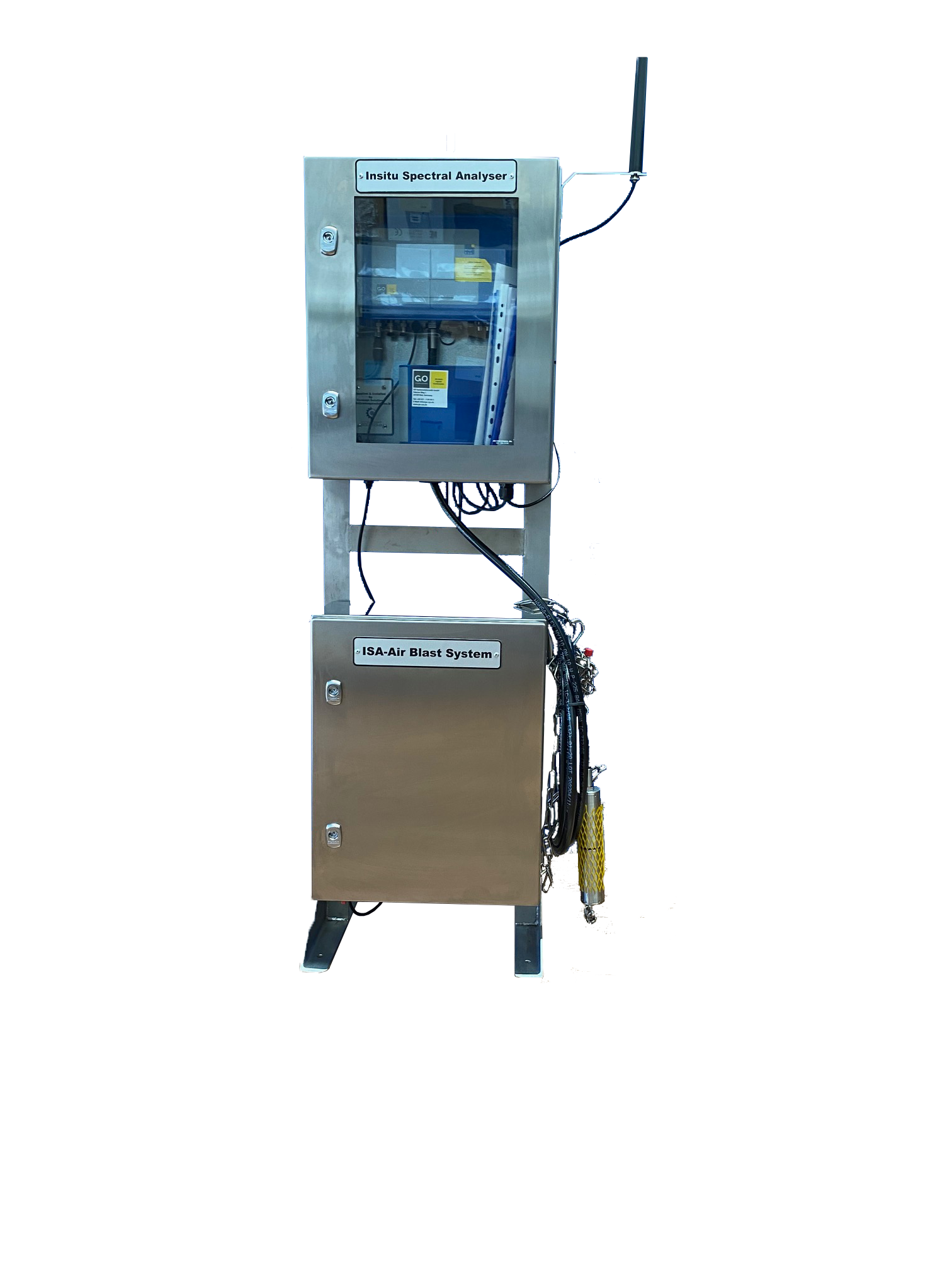 The Frame Mounted Systems are generally supplied with an air blast cleaning unit. Compressed air is supplied at 4barG for 5 to 10 seconds at intervals to keep sensors and optical windows clean. This really enhances the instrumentation and reduces manual cleaning to a minimum at once per month.